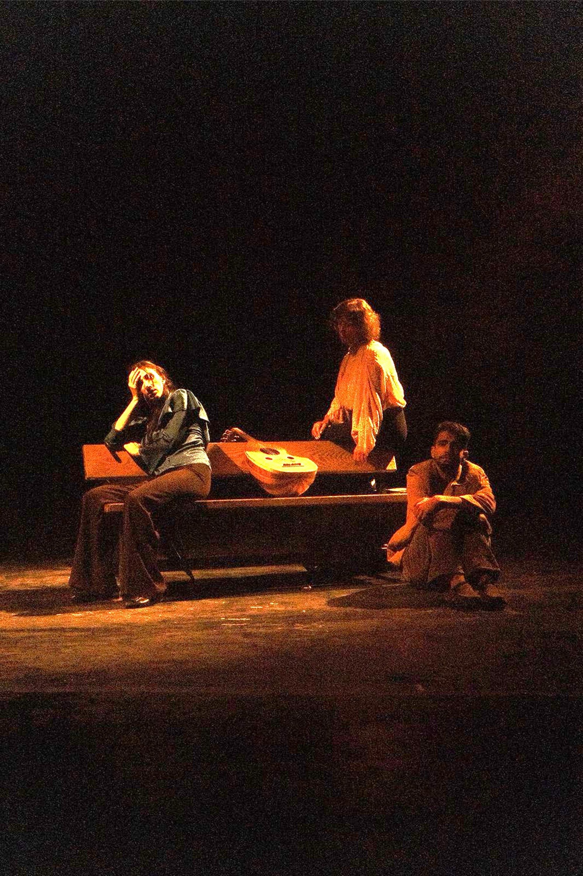 على الخشبة نرى الباب، والعود، والكرسيّ الخشبيّ، وكابينة الهاتف العموميّ التي لم تُستخدم لغرضها المباشر. إذ فعّل العرض رمزيّة هذه العناصر.