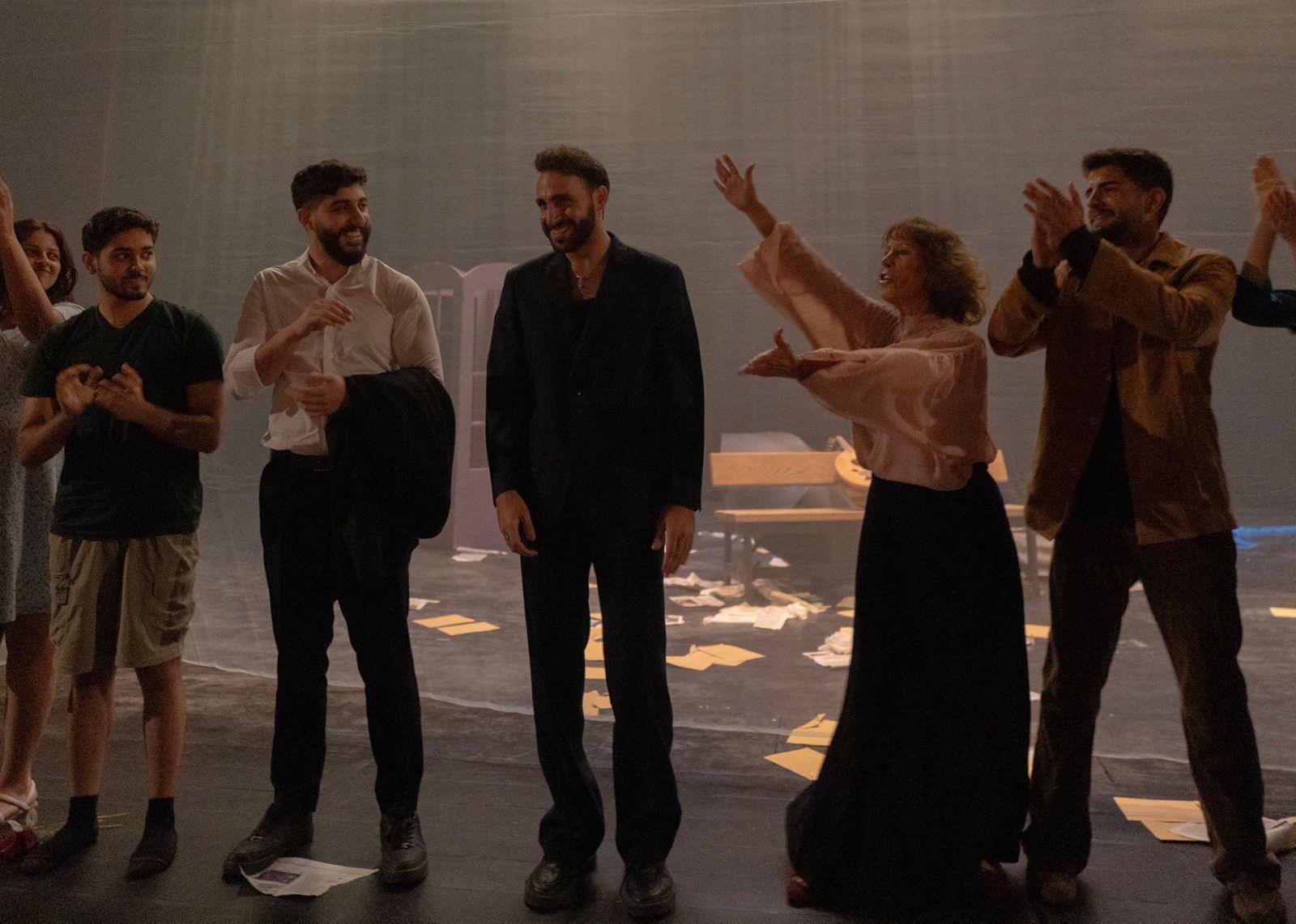 لا ستارة حمراء تُفتح معلنةً بداية العرض، بل قطعة قماش شفّافة تلازم المشهديّة طوال العرض. نتساءل عن اللحظة المناسبة لإزاحتها، لكنّها تبقى قائمة كحاجزٍ يفصل بين الممثّلين والجمهور، بين المرسِل والمتلقّي.